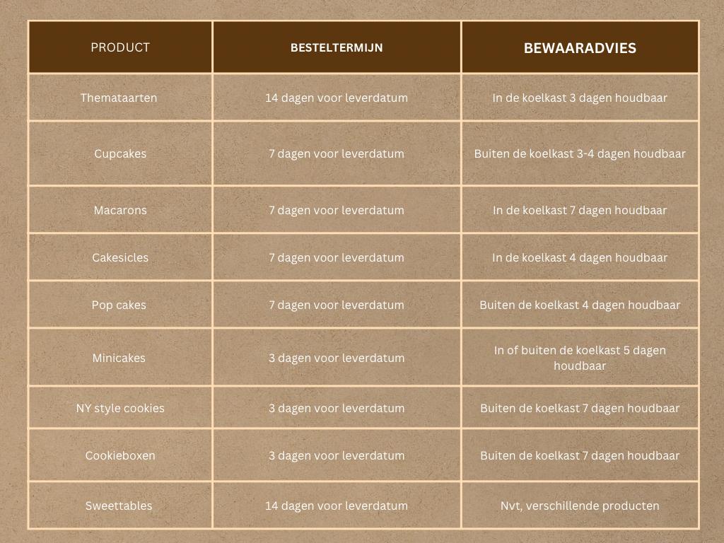 Voor elke bestelling (m.u.v. bruidstaarten) geldt er een aanbetaling van 50% van de afgesproken prijs, de reservering staat pas vast na ontvangst van de aanbetaling.