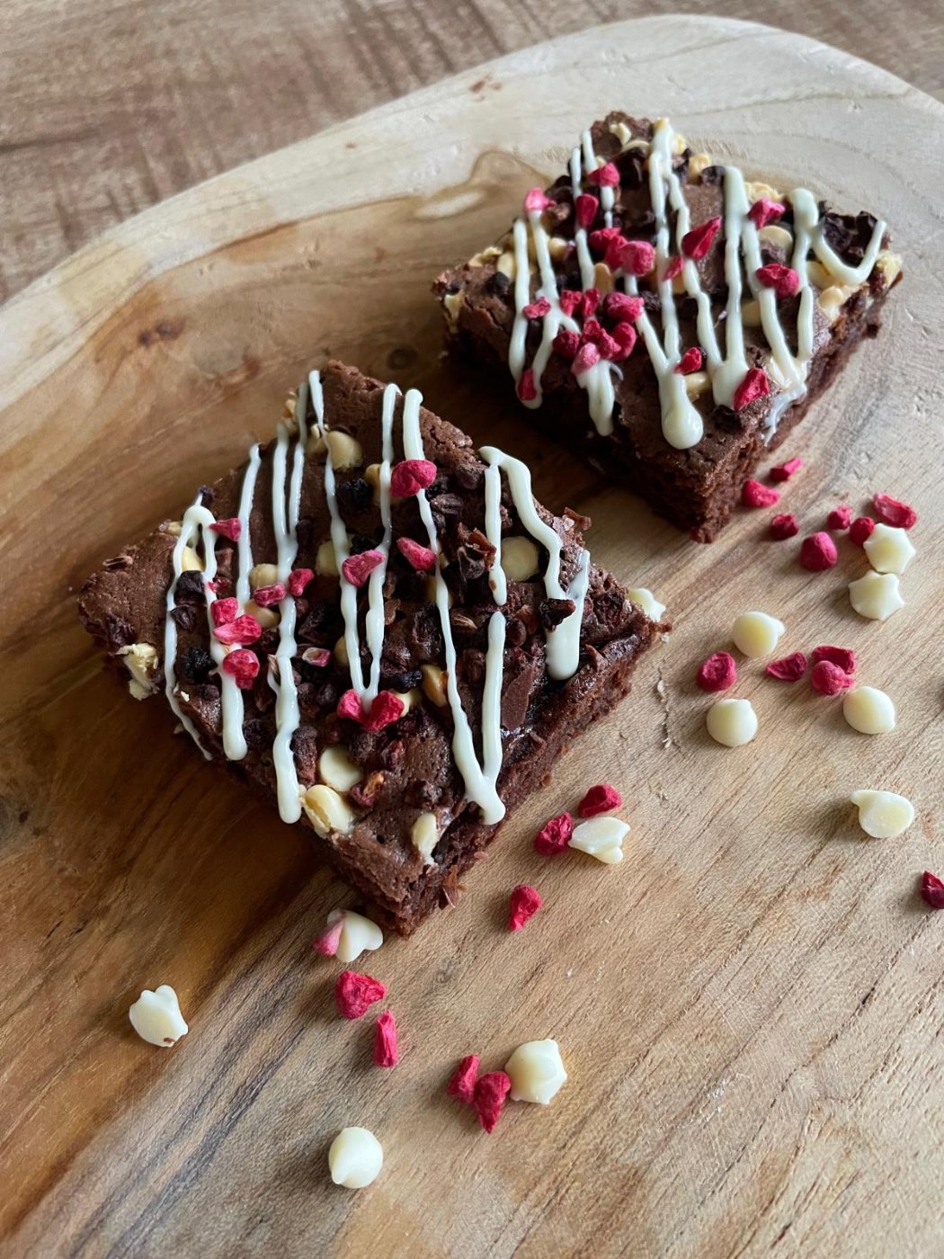 heerlijke smeuige brownie afgewerkt met witte chocolade en framboos