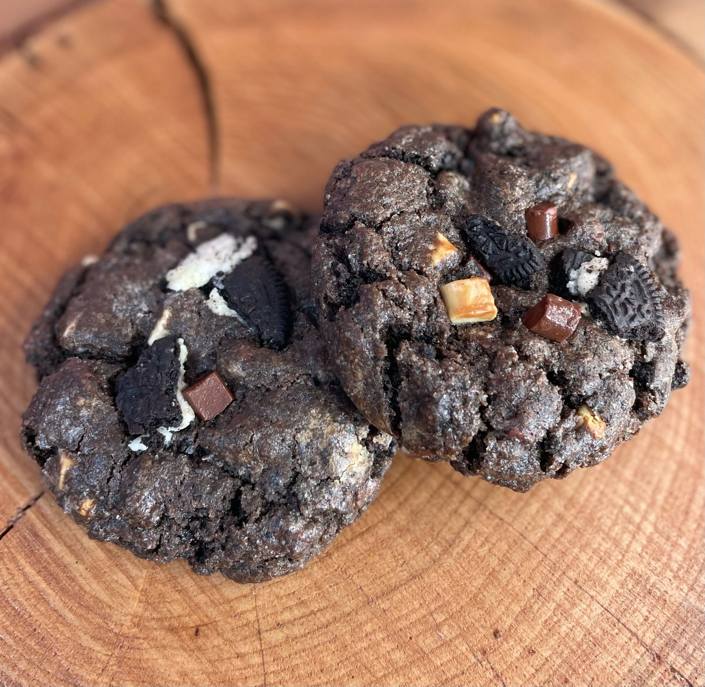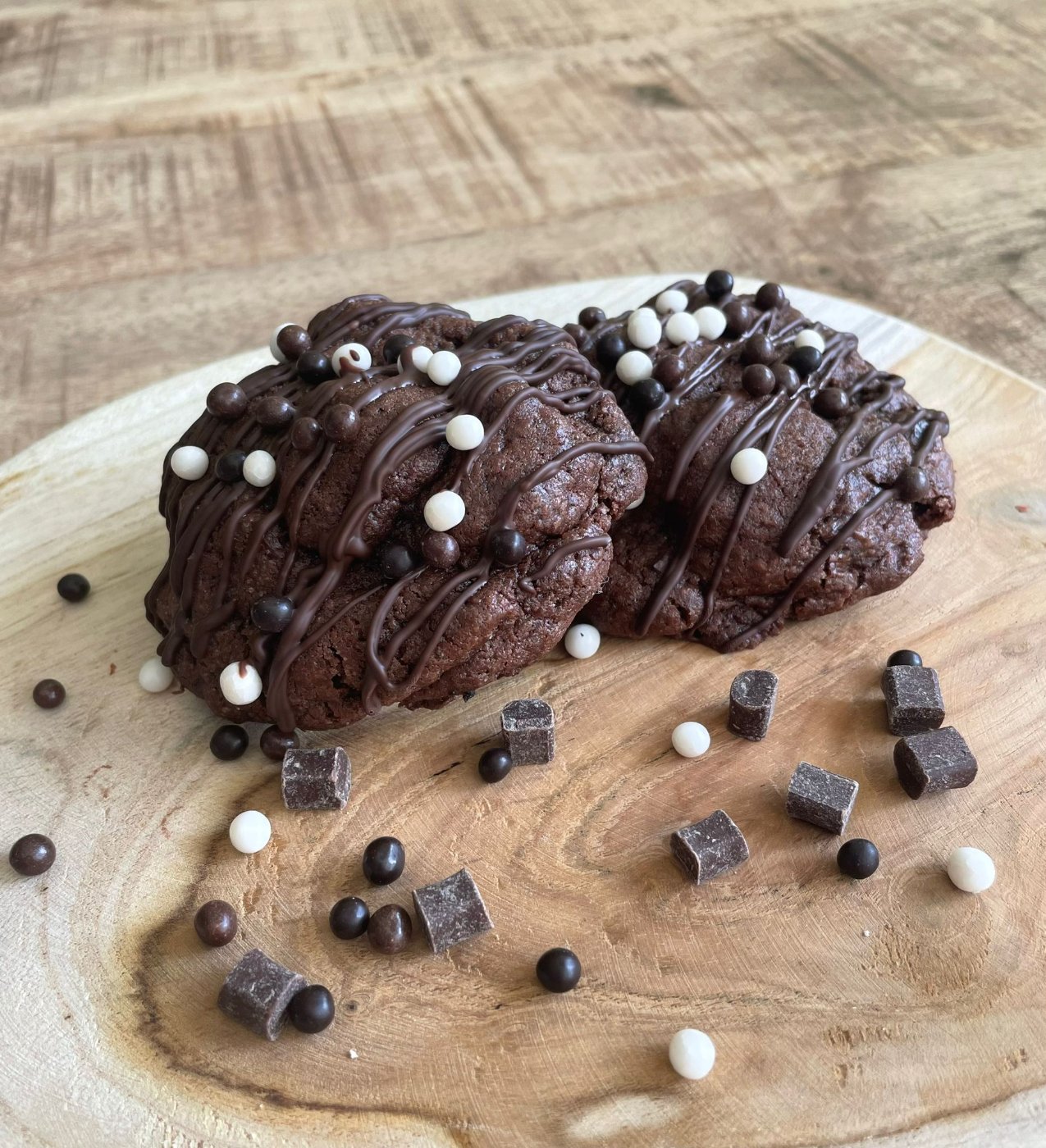 Chocolade koek, met stukjes oreo, witte en pure chocolade chips en een witte chocoladecreme vulling