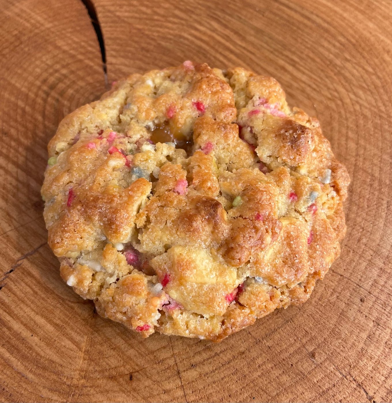 Vanille koek, bomvol kleurrijke sprinkles, witte chocolade chunks en een caramel vulling