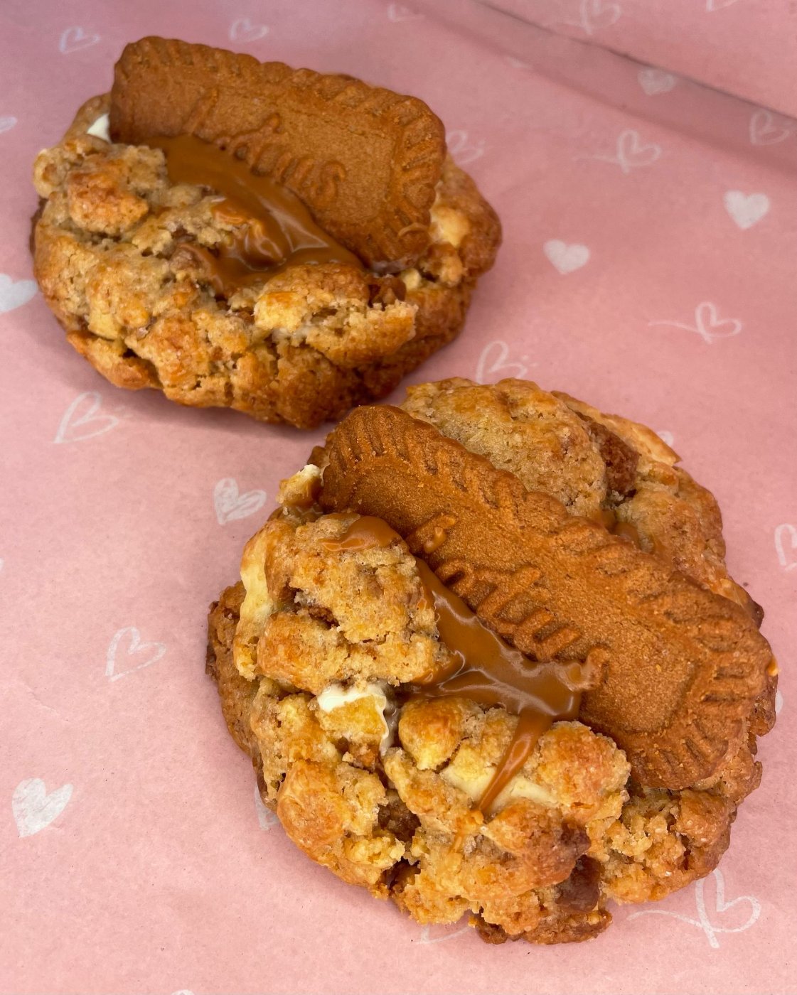 Een heerlijke speculoos koek met stukjes witte en melk chocolade en een kern van Lotus creme.