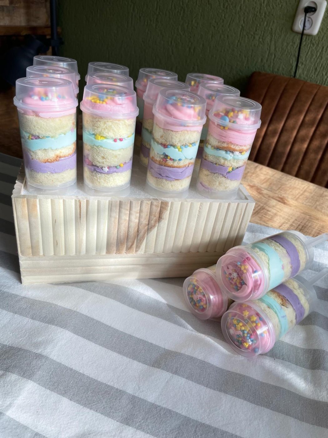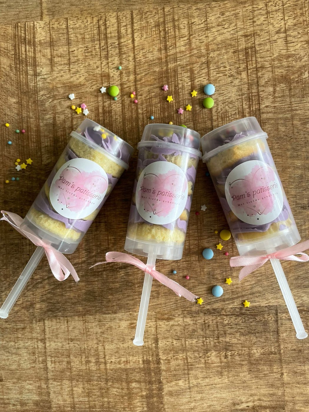 Een fantastische manier om trakteren op school of op een feestje! Push up cake pops zijn gemaakt van heerlijke vanille of chocolade cake met daartussen een smakelijke vulling in kleur naar keuze!