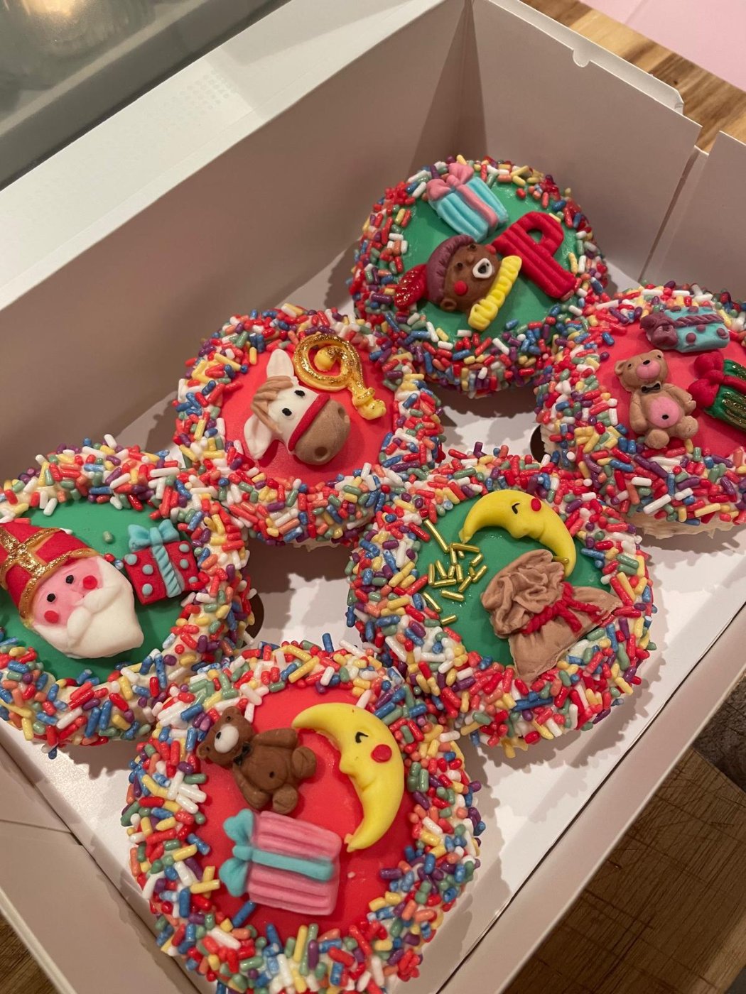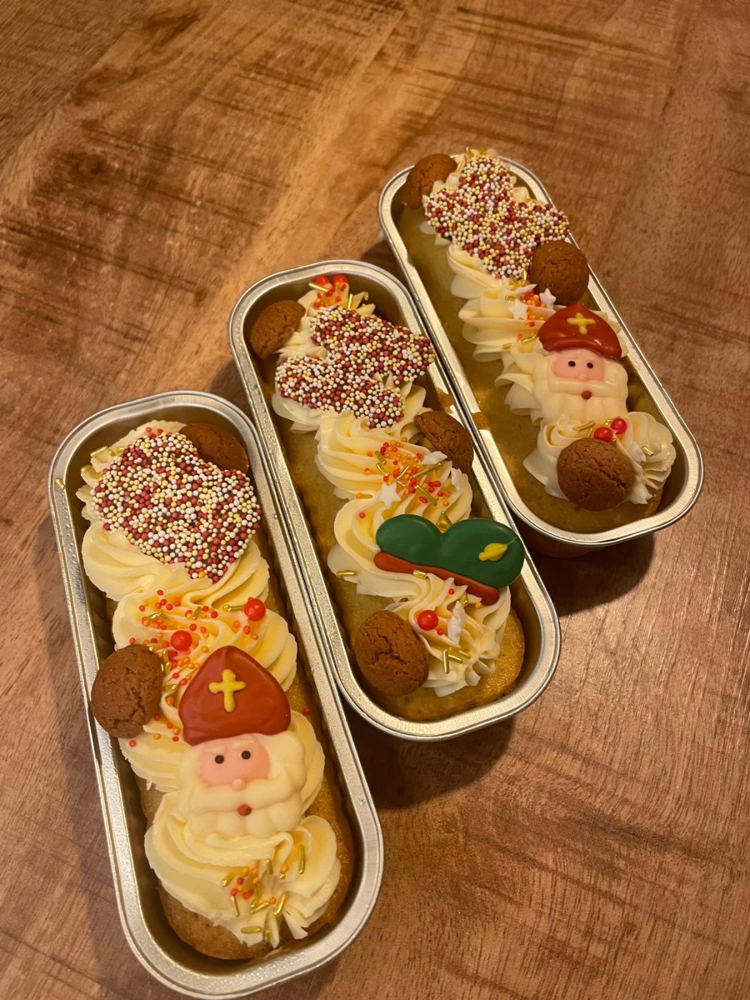Heerlijke roomboter vanille minicakes, gedecoreerd met vanille creme, sint chocolade, kruidnoten en sint sprinkles!