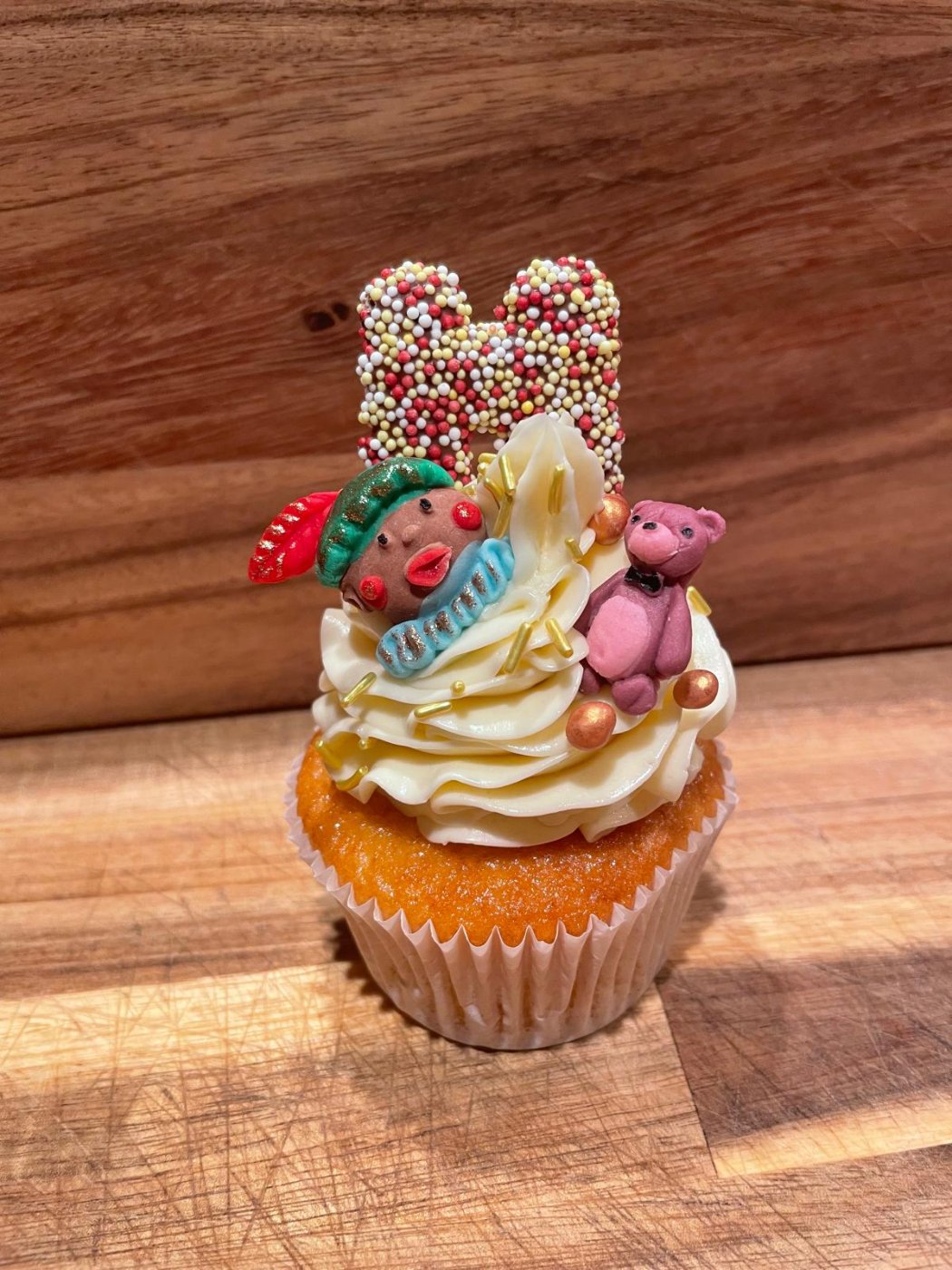 Heerlijke roomboter vanille cupcakes met vanille creme en Sinterklaas figuren van fondant en kleurrijke sprinkles