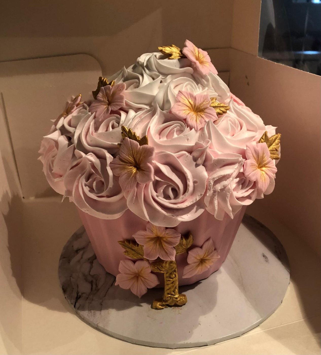 Smashcake in de vorm van een mega grote cupcake. Versiert met toefjes heerlijke botercreme of enchanted cream in kleur(en) naar wens.
